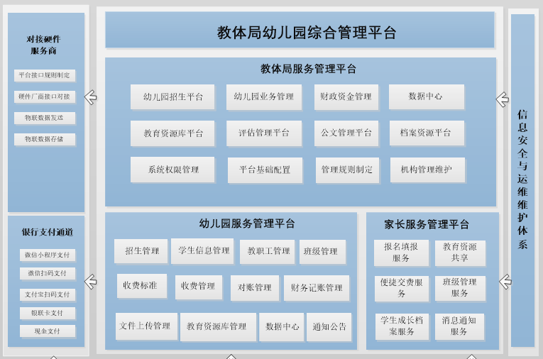 另外,打通园所端一键共享通道,在平台的业务管理模块,设置园所的办园资质、班额管理、学生档案、师资建设、收费管理、财务记账、通知公告等功能,在平台完成幼儿、教师的信息录入管理,幼儿和教师的数据共享教体端,提供了实时的分析管理支撑,也为家长端提供反馈和指导;平台一体化的收费管理,支持一键生成对应账单,家长端可以直接通过微信或支付宝实现一键交费,教体端可严控收费标准,监管收费行为,确保财政资金规范化使用。通过安全、便捷、高效、灵活和开放的服务平台,不断提升园所信息化管理水平,建设高质量的学前业务管理体系。